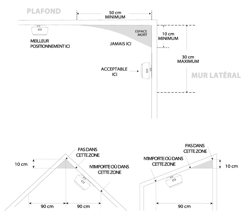 - Si un détecteur est installé sur un mur, une distance de 10 à 30 cm (4 à 12 pouces) doit être observée sous le plafond.